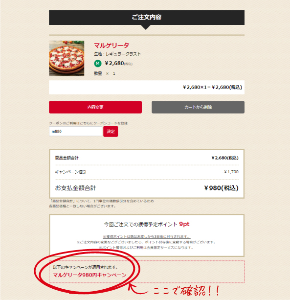 - 「カートページ」にてクーポンコード【M980】を入力し、決定ボタンを押す